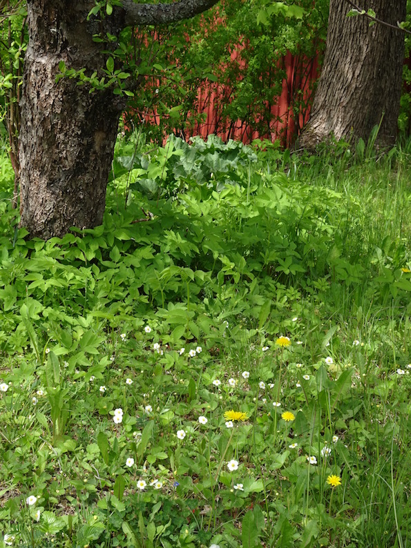 Myös omenapuun alla rehottaa ja kukkii.